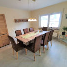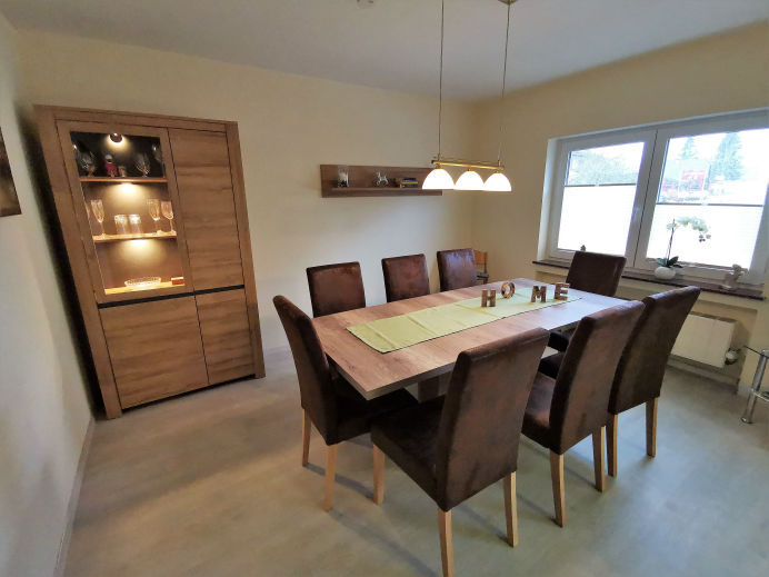In de eetkamer is een grote eettafel met plaat voor 8 personen.
