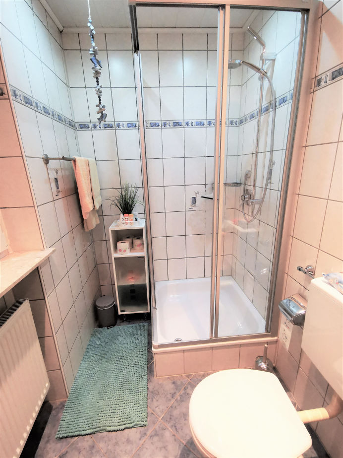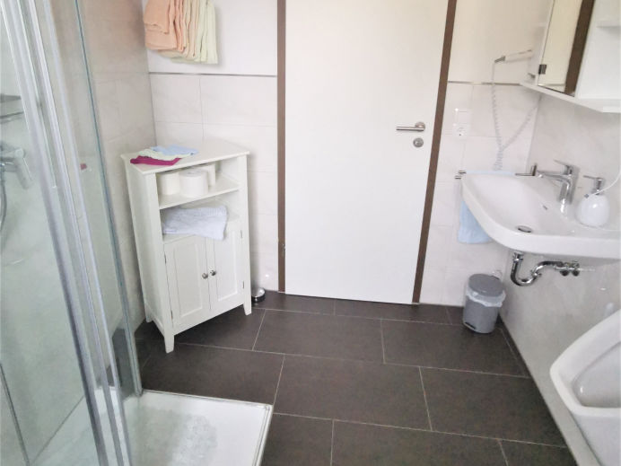 bevindt zich op de begane grond en beschikt over een douche, toilet, wastafel, spiegelkast en föhn.