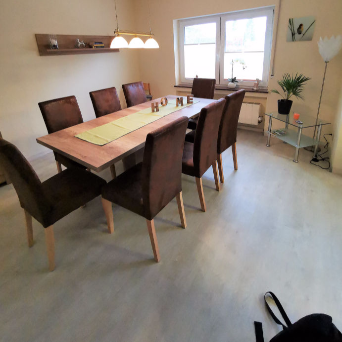 Met grote tafel voor 8 personen. Hier kunt U fijn zitten tijdens het eten en gezellig samenzijn.