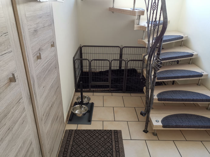 Voor Uw hond hebben we in de hal een hoek ingericht. Een ca.160x 60 cm grote bench met dik hondekussen. Een eet/drink set staat daar ook.