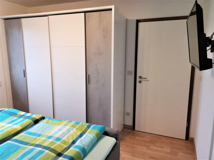 Gestoffeerd tweepersoons bed. Kledingkast en televisie, als ook toegang tot het balkon